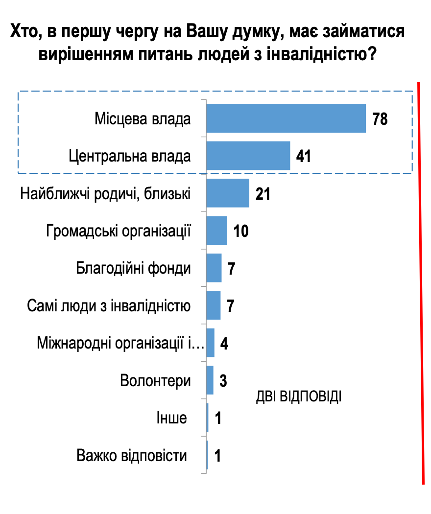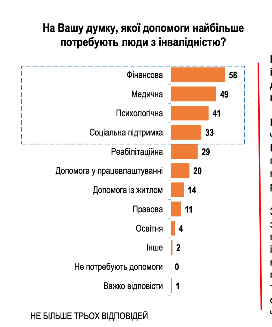 "Почти 60% опрошенных отметили, что люди с инвалидностью больше нуждаются в финансовой помощи, почти 50% - в медицинской, более 40% - в психологической", - сообщает также "Рейтинг".