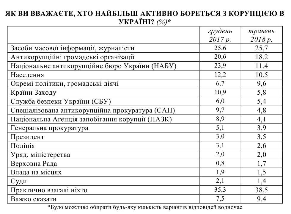 Очень незначительный процент населения среди активных борцов с коррупцией указывали те государственные институты, которые и должны бороться с коррупцией: СБУ (5%), Специализированную антикоррупционную прокуратуру (5%), Национальное агентство по предотвращению коррупции (4%), Генеральную прокуратуру (4%), президента (4%), полицию (3%), правительство, министерства (2%) Верховную Раду (2%), власть на местах (1,5%), суды (1%).