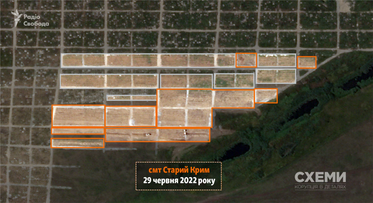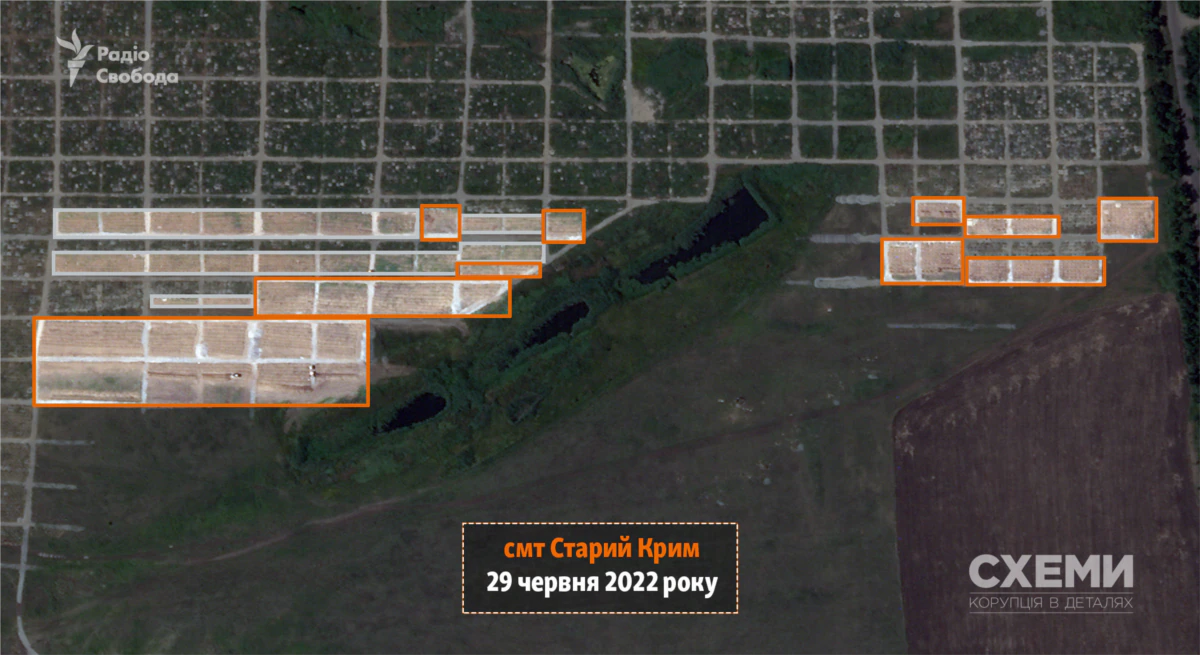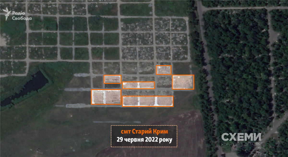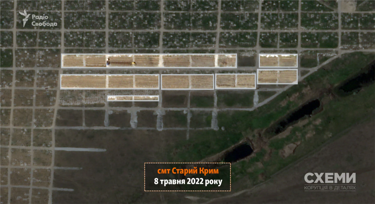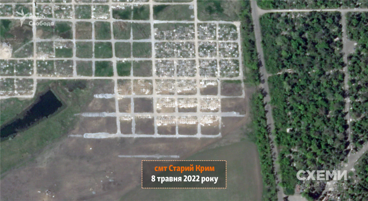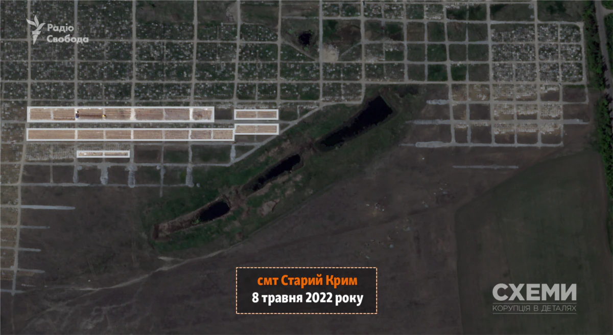 Площадь братских могил во временно захваченном российскими войсками поселке Старый Крым, расположенном возле Мариуполя, с 8 мая по 29 июня увеличилась почти в два раза. Свидетельством тому являются спутниковые снимки Planet Labs, опубликованные журналистами «Схем».