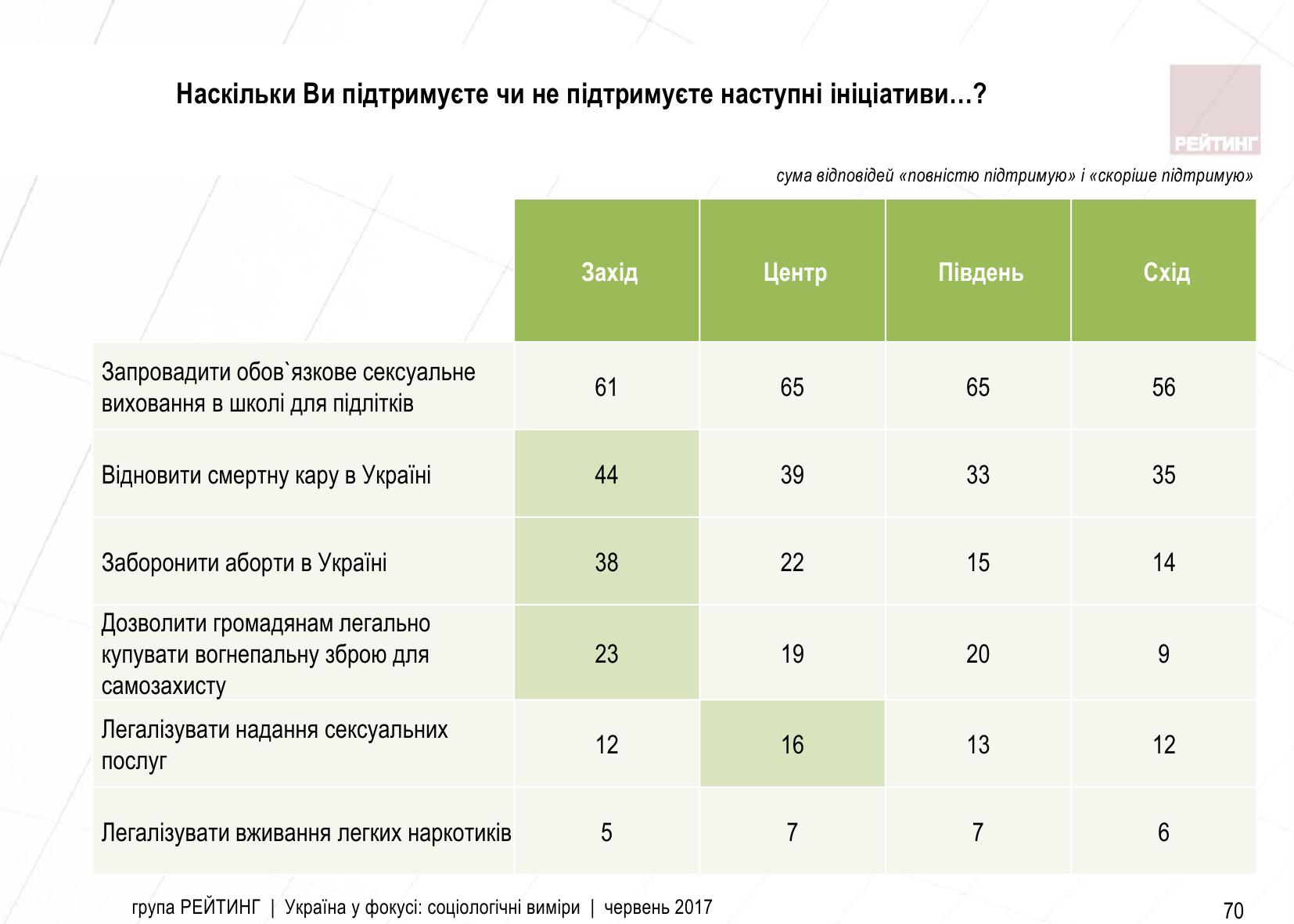 На Западе больше поддерживают инициативы восстановления смертной казни, запрета абортов, легализации покупки огнестрельного оружия, в Центре большей степени поддерживают легализацию предоставления сексуальных услуг.