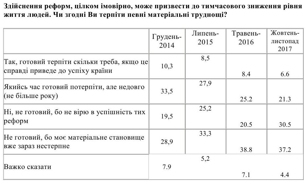 Менее трети украинцев (28%) готовы терпеть снижение уровня собственной жизни ради конечного успеха реформ (из них 7% готовы терпеть столько, сколько нужно, а 21% – не больше года), свидетельствуют данные опроса фонда "Демократические инициативы" и КМИС.