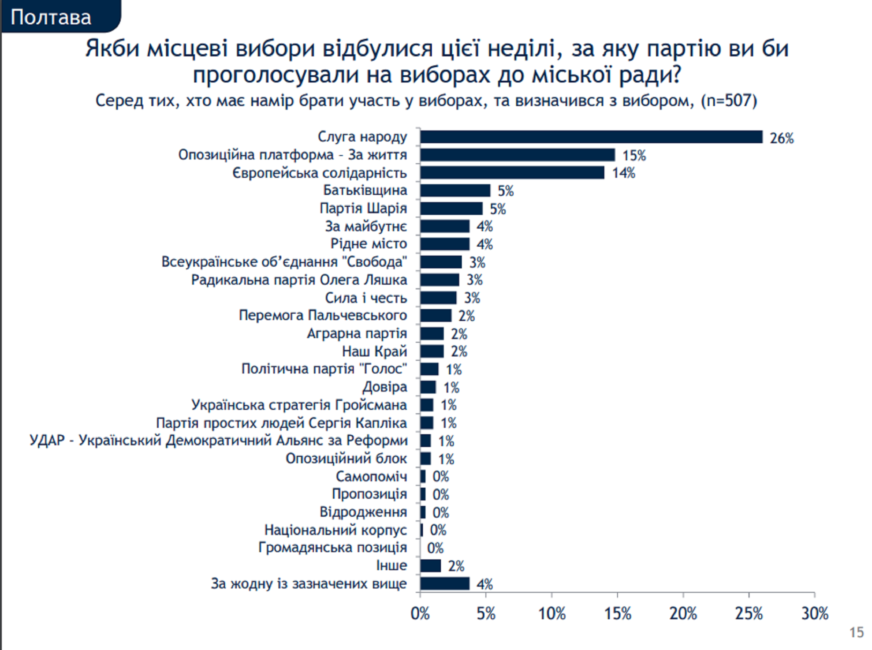 Хотя в Полтаве, как и во многих других украинских городах, партийные бренды вторичны. Первичны договоренности. Ожидается, что в городскую раду пройдут «Слуга народа» (26%), ОПЗЖ (15%), ЕС (14%), «Батьківщина» (5%) и «Рідне місто» (4%). «Свободе» (3%) и «Партии простых людей» (1%) — сложнее.