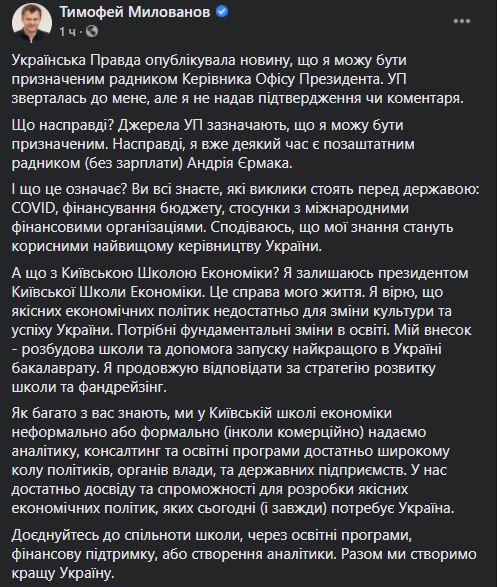 Бывший министр развития экономики, торговли и сельского хозяйства Тимофей Милованов написал в Facebook о своем возможном назначении советником Ермака.