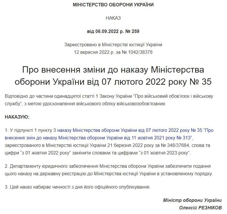 «В подпункте 1 пункта 3 приказа Министерства обороны Украины от 07 февраля 2022 N 35 "О внесении изменений в приказ Министерства обороны Украины от 11 октября 2021 N 313", зарегистрированного в Министерстве юстиции Украины 21 марта 2022 за N 348/36 слова и цифры "с 01 октября 2022" заменить словами и цифрами "с 01 октября 2023"», - говорится в тексте указа, который 12 сентября зарегистрировали в Минюсте.