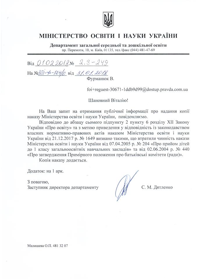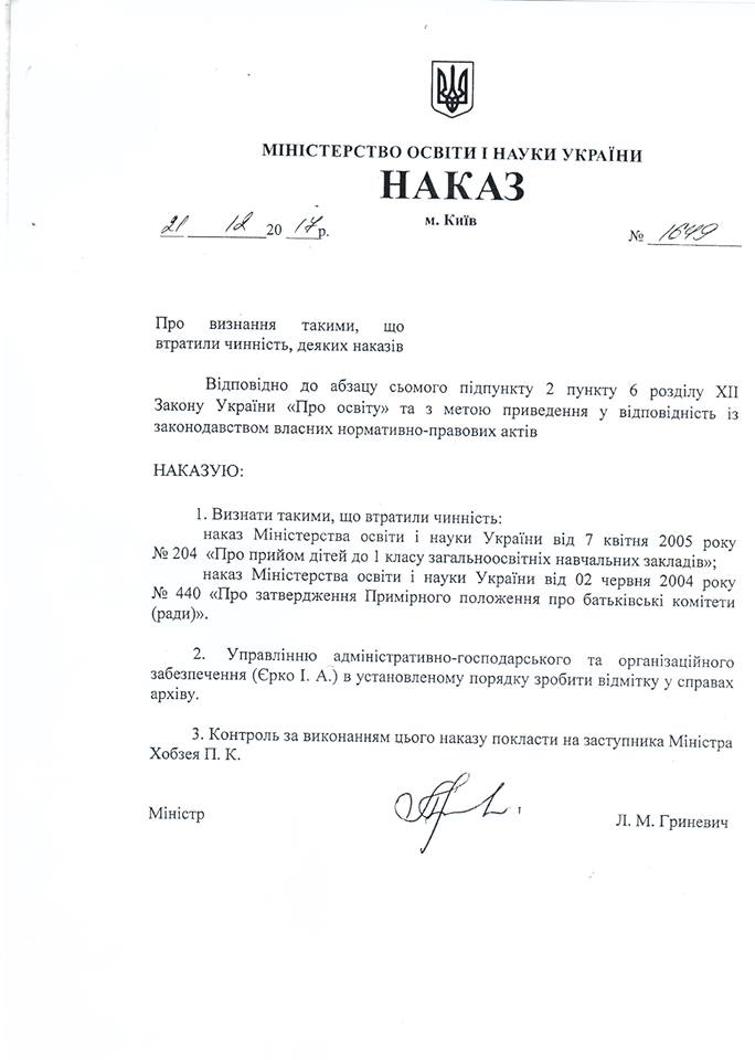 Министр образования Лилия Гриневич подписала приказ №1649, отменяющий деятельность родительских комитетов в школах, говорится в ответе Минобразования на запрос активиста Виталия Фурманюка, обнародованном в Facebook.