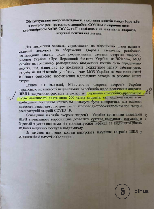 Кроме того, в документах есть информация о выделении 100 млн гривен на закупку 200 аппаратов искусственной вентиляции легких. Но, как подчеркивается в расследовании, речь идет об отечественных разработках, которые планируют покупать по 500 тысяч гривень за каждый.