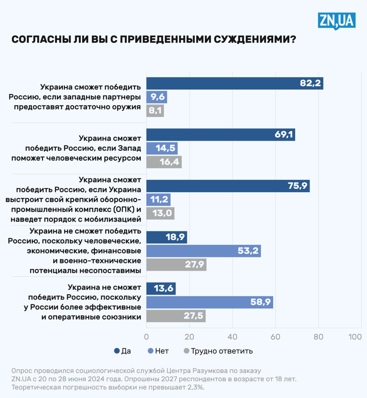 В частности, по результатам социологического опроса, проведенного по заказу ZN.UA Центром Разумкова, 82% граждан убеждены, что Украина может победить РФ, если западные партнеры предоставят достаточно оружия. И это самый высокий процент надежды.