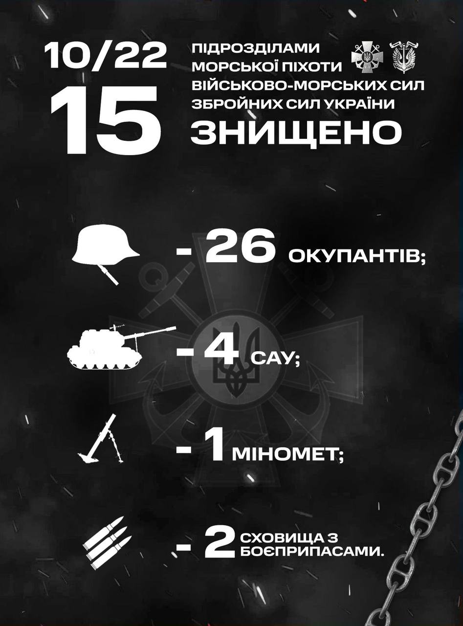 Украинские морские пехотинцы за сутки уничтожили два склада боеприпасов войск РФ, информирует ВМС ВСУ в Telegram.