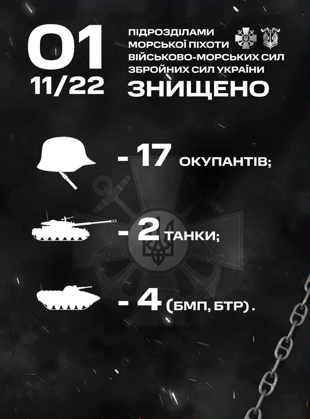 Украинские морские пехотинцы во вторник, 1 ноября, ликвидировали 17 оккупантов и уничтожили шесть единиц военной техники РФ, информирует ВМС ВСУ в Facebook.