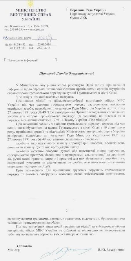 Министерство внутренних дел Украины предоставило официальный перечень спецсредств, которые использовали правоохранители на ул. Грушевского в Киеве. Соответствующее письмо от имени главы МВД Виталия Захарченко было направлено в ответ на запрос народного депутата "Батькивщины" Леонида Емца. Документ обнародован на его странице в Facebook.