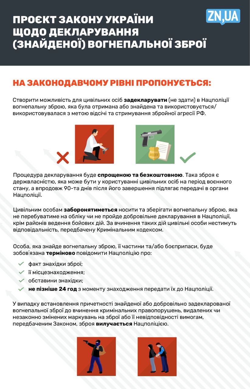 Процедура декларирования будет упрощенной и бесплатной. Такое оружие является государственной собственностью, которая может находиться во владении и пользовании гражданских лиц на период военного положения. В течение 90 дней после его завершения оружие подлежит передаче в органы Национальной полиции.