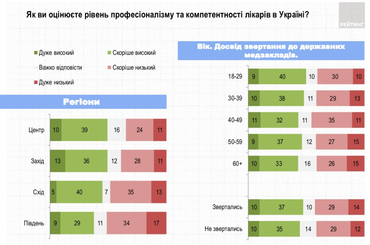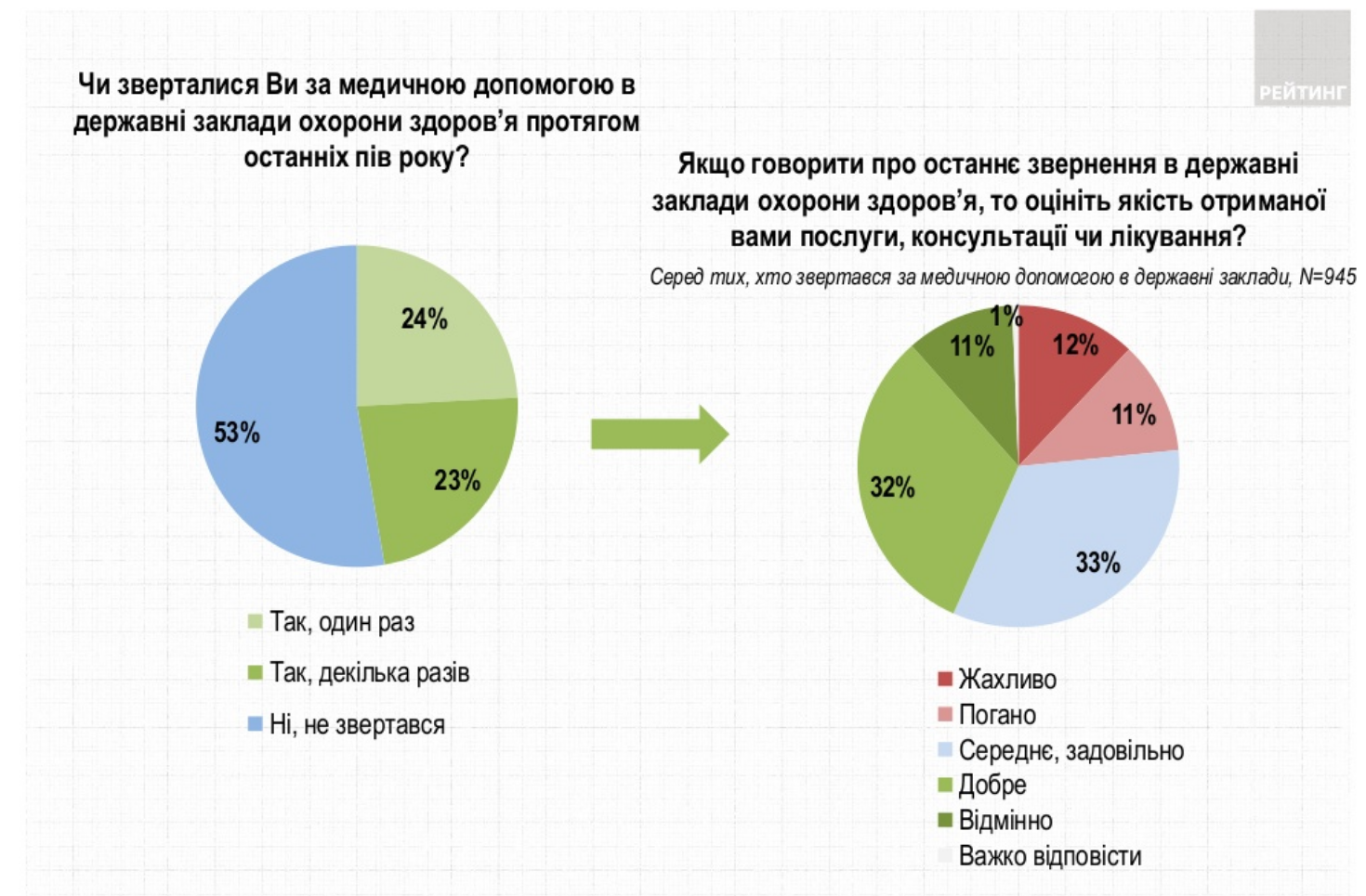 Среди тех, кто обращался за помощью к врачам, 43% на хорошо, или отлично оценили качество полученных услуг. 33% оценили на удовлетворительно, 23% - на плохо или ужасно. Последних больше всего среди старшей возрастной группы (60+ лет), жителей городов, бедных и мужчин.