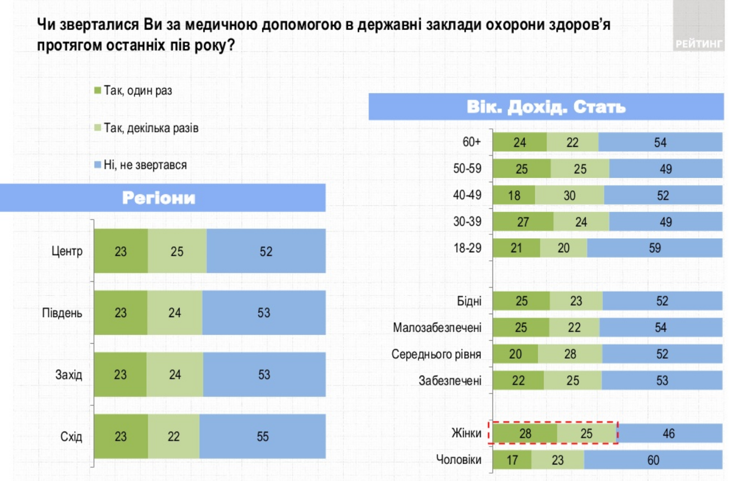 47% опрошенных обращались за медицинской помощью в государственные учреждения здравоохранения в последние полгода. 53% - не обращались. Последних больше среди младшей возрастной группы (18-29 лет) и мужчин.