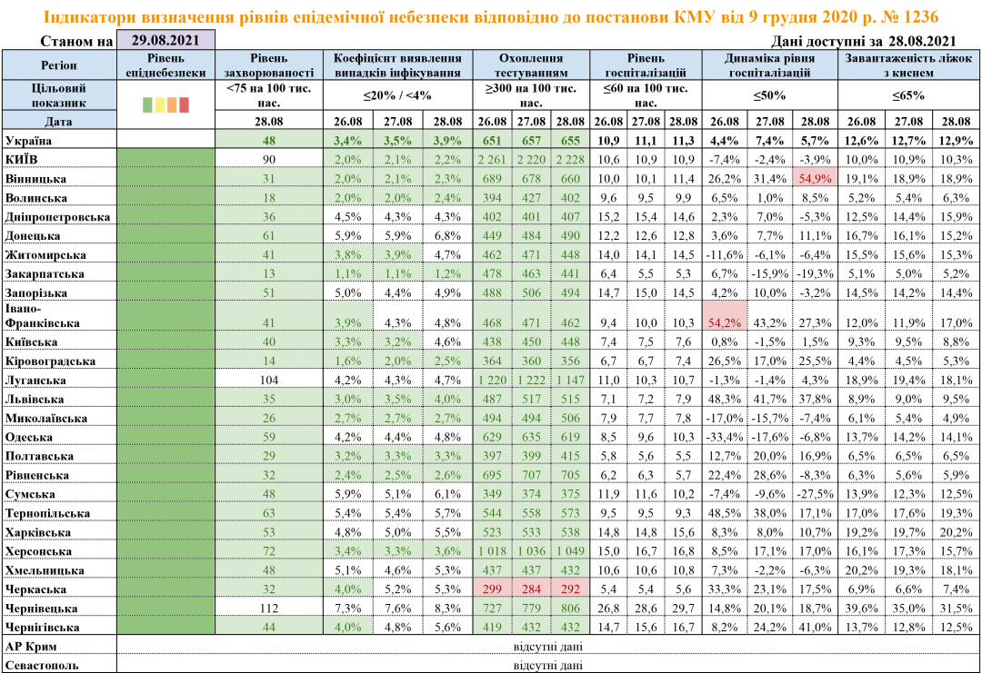 В Украине две области: Винницкая и Черкасская, по состоянию на 29 августа, не соответствуют «зеленой» зоне эпидемической опасности по одному из показателей, информирует Министерство здравоохранения.