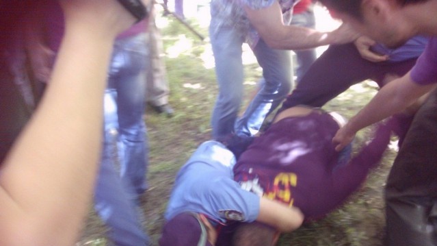 "То, что они делают, лишает их права вообще называться спортсменами. Сначала эти люди просочились в толпу, и затем началась драка. Возле меня стоял журналист, которого один из этих гопников жестко ударил по лицу. Другого человека вообще избили до крови. На видео все это есть. Мы требовали у правоохранительных органов задержать виновников, но они повалили на землю другого человека, лицо которого было в крови", - заявил Ризаненко.