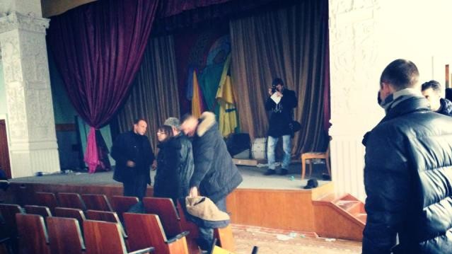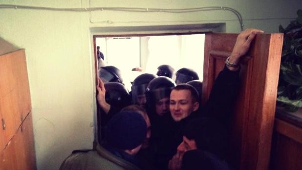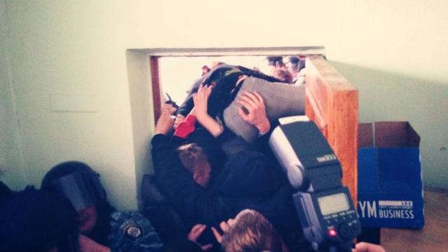 Представители ВО "Свобода" пытались прорваться на заседание, проходящее в актовом зале на 7 этаже, но им противостояли силовики и, по данным самих свободовцев, представители молодежной ячейки Партии регионов.
