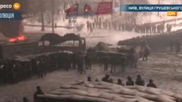 В столкновениях на Европейской площади и улице Грушевского появился БТР. Он подъехал со стороны "Беркута", и остановился перед баррикадами и рядом горящих шин.