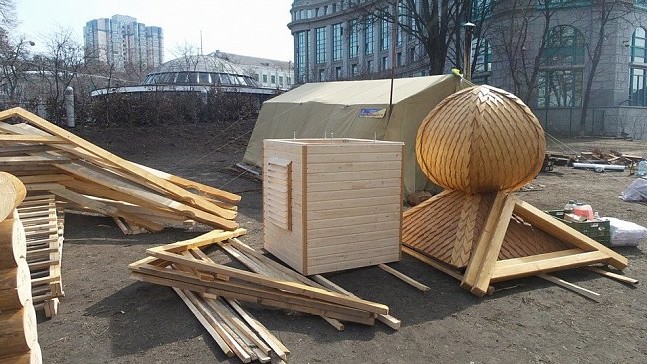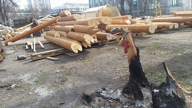 На улице Институтской в Киеве в месте массового расстрела участников Майдана строят деревянную часовню. На место будущего строительства уже подвезли бревна, деревянные купол и кресты.