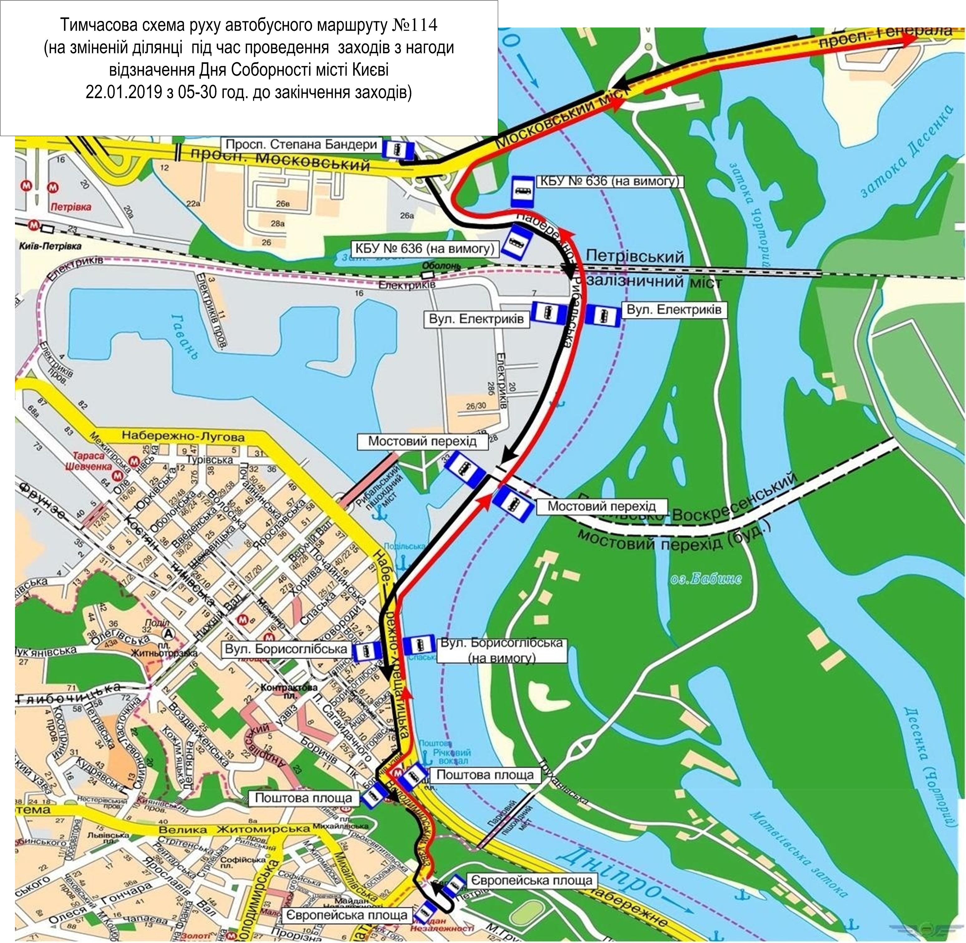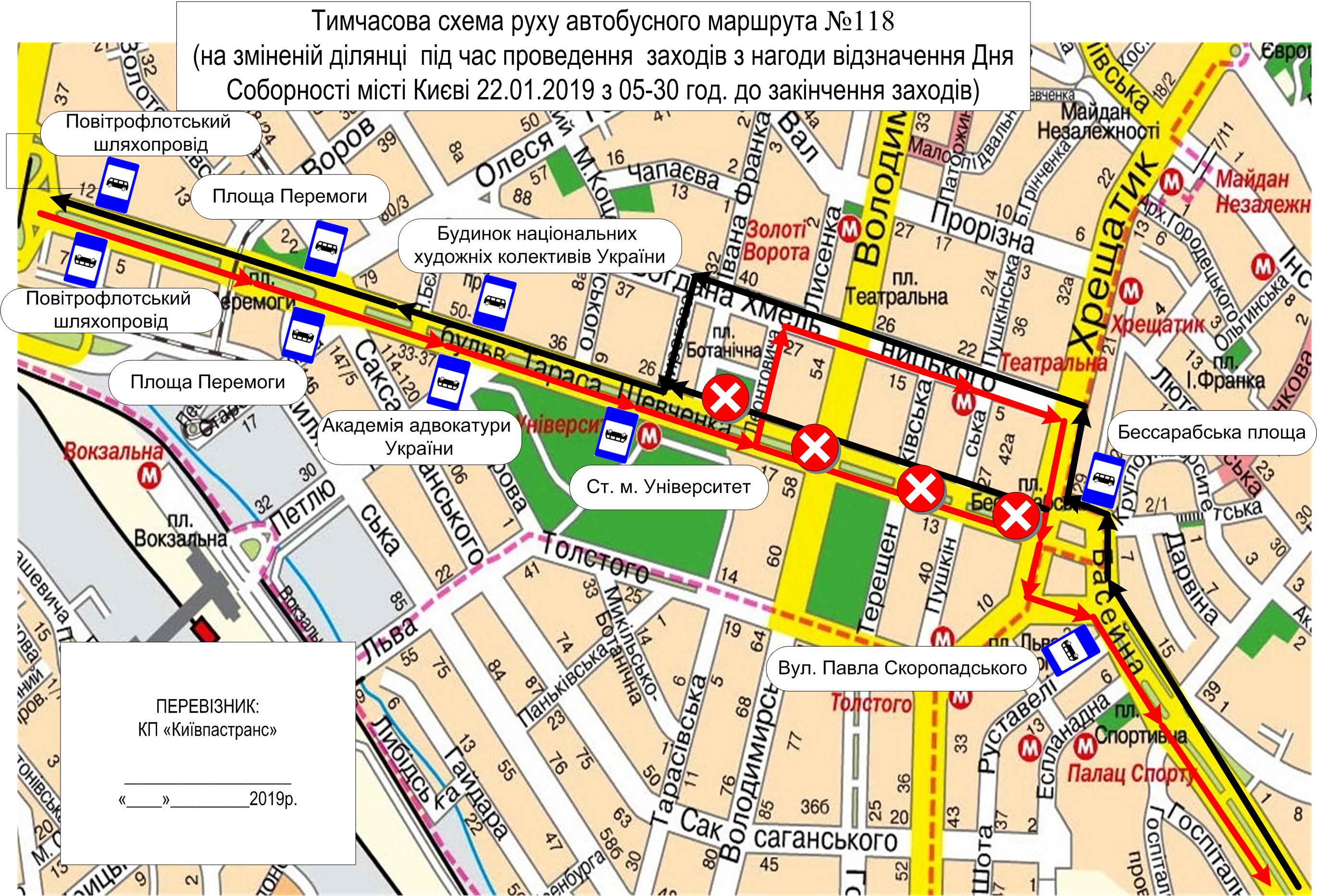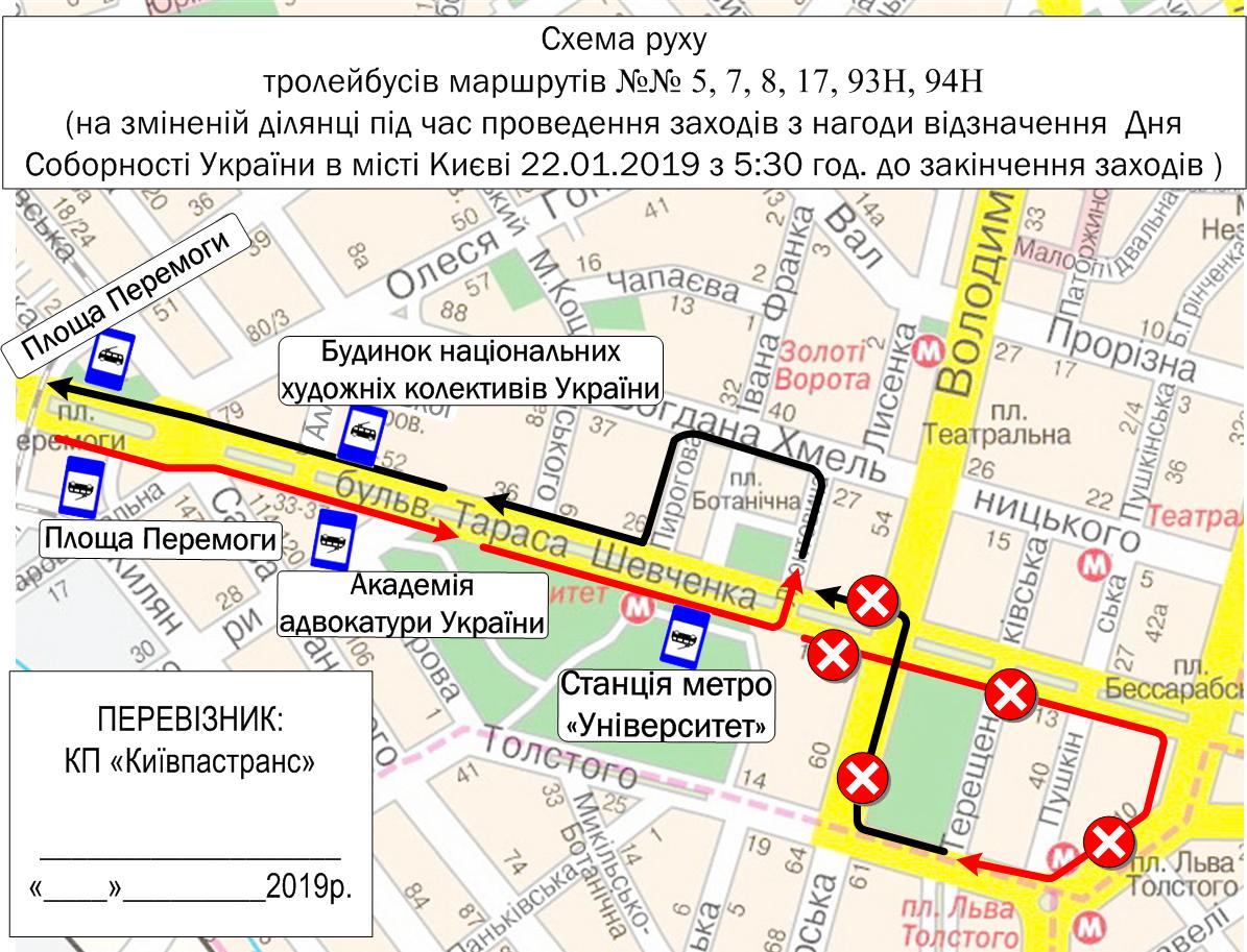 "В связи с празднованием Дня соборности Украины 22.01.2019 года в городе Киеве движение всех видов транспорта, в том числе общественного, будет ограничено с 05:30 до окончания мероприятий", - говорится в сообщении.