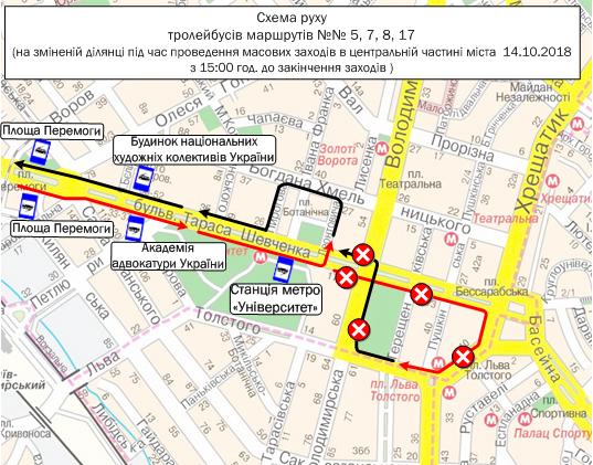 В День защитника Украины, 14 октября, в связи с проведением массовых мероприятий в центре Киева с 15:00 будет запрещено движения всех видов транспорта на ул. Владимирской (на участке от ул. Льва Толстого к б-ру Шевченко), б-ре Шевченко (на участке от ул. Владимирской до Бессарабской площади), ул. Крещатик (на участке от Бессарабской площади до Европейской площади) и Европейской площади.