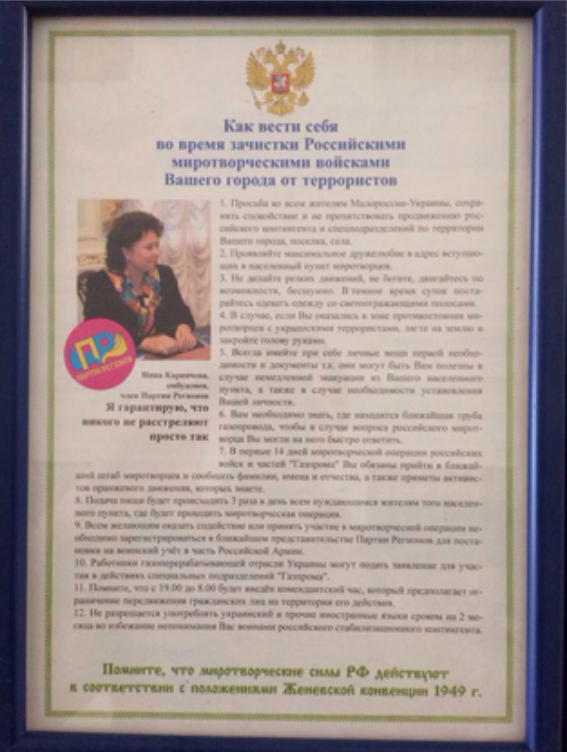 Как сообщает отдел по связям с общественностью ГУ МВД в Днепропетровской области, на открытках сепаратистского характера говорится о "правилах поведения во время "зачистки" города российскими миротворцами от террористов".
