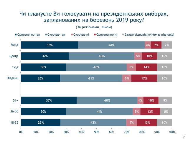 Интерес к голосованию самый высокий в Западной и Центральной Украине, наименьший - в Восточной и Южной. Молодые люди наименее заинтересованы в голосовании - только 26% из них заявили, что "однозначно" проголосуют по сравнению с 37% опрошенных в возрасте от 51 года и старше.