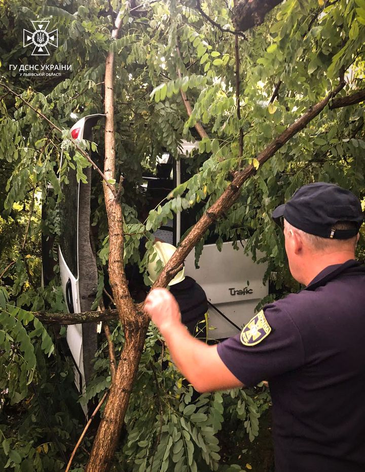 В то же время, как сообщили в ГСЧС, во Львовской области в городе Самбор дерево упало на автомобиль с людьми. Семья припарковалась возле дома, но не успела выйти из автомобиля – дерево их заблокировало. К счастью люди не пострадали, но нуждались в помощи спасателей, чтобы выйти из автомобиля.