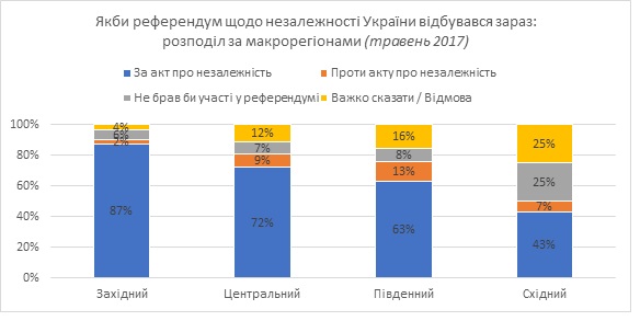 За прошедший год поддержка независимости Украины немного усилилась: доля тех, кто проголосовал за акт о независимости, увеличилось с 64% населения в мае 2016 года до 70% в мае 2017 года (или с 87% до 90% тех, кто принял бы участие в голосовании).