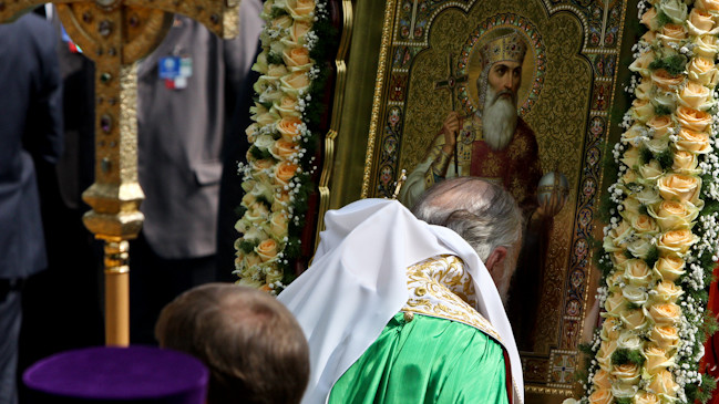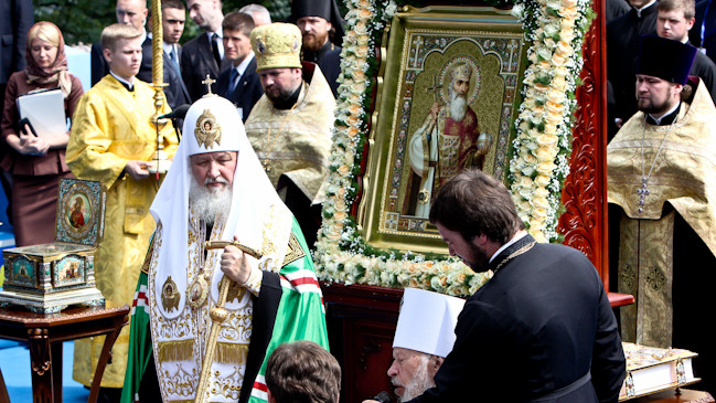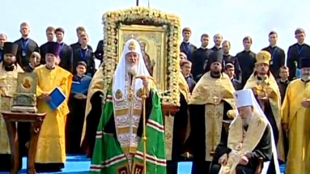 За 10 минут до начала молебна в Владимирской горке прибыл патриарх Кирилл. Около 10-15 бабушек пытались поприветствовать его у начала коридора, ведущего к памятнику, однако не смогли рассмотреть это ли он. Патриарх прибыл на кортеже из автомобилей.