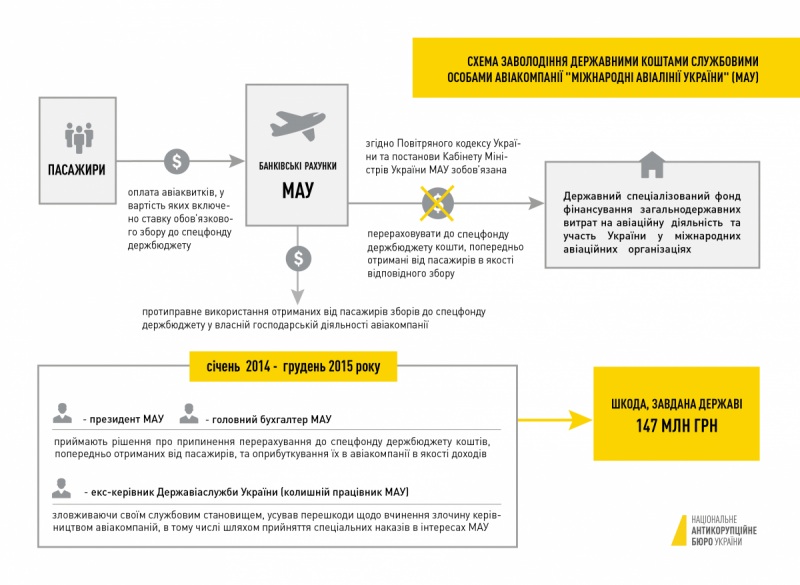 "Досудебным расследованием установлено, что на протяжении 2014-2015 годов руководство МАУ при содействии служебных лиц Госавиаслужбы Украины незаконно завладело средствами Государственного специализированного фонда финансирования общегосударственных трат на авиационную деятельность и участие Украины в международных авиационных организациях в особо крупных размерах", – указывается в сообщении ведомства.