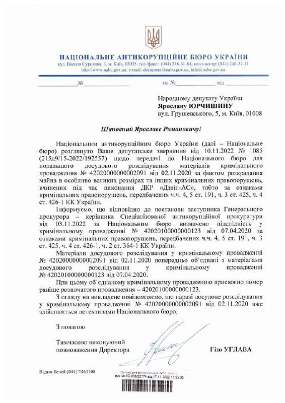 НАБУ ответило на запрос народного депутата Ярослава Юрчишина, сообщив, что «проводят расследование сразу по нескольким статьям уголовного кодекса: растрата в особо крупных размерах, небрежное отношение к военной службе, превышение властных полномочий, в том числе – военными лицами».