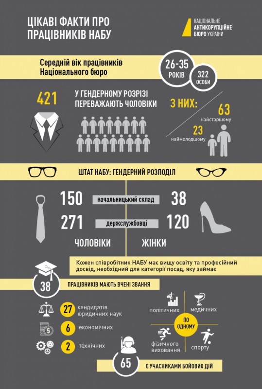В настоящее время оперативную и следственную работу в Бюро выполняют 168 детективов и 36 аналитиков. Всего в открытом конкурсном отборе приняли участие более 22 тысяч граждан, на каждое вакантное место претендовали от 35 до 40 человек.