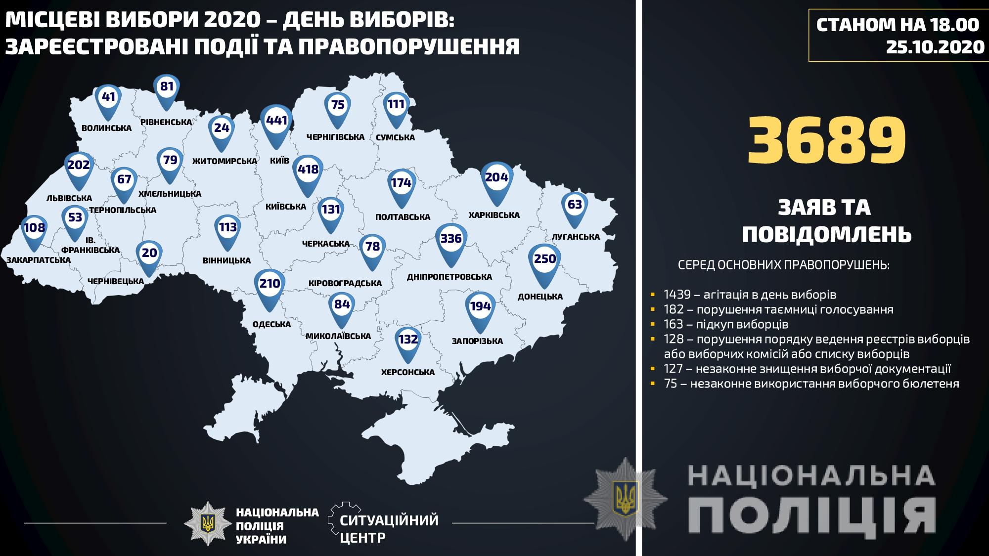 Правоохранители получили 3689 сообщений о правонарушениях, связанных с избирательным процессом. По данным фактам зарегистрировано 61 уголовное производство и составлено 169 админпротоколов. Данные по состоянию на 18:00 воскресенья, 25 октября, опубликованы на сайте Национальной полиции.