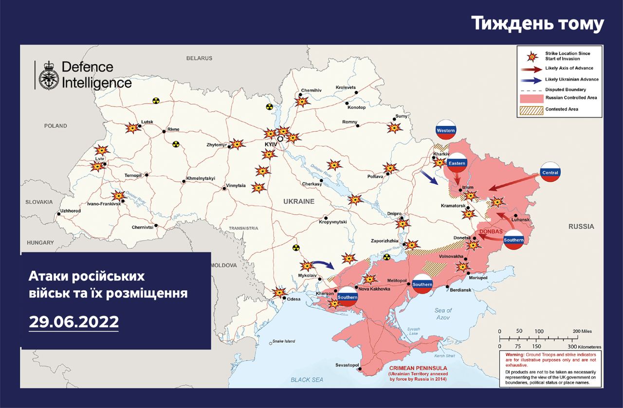 Минобороны Британии опубликовало обновленную карту боевых действий в Украине по состоянию на 6 июля, 133-й день полномасштабной войны с РФ. В сообщении на странице в Твиттере пресс-служба ведомства снова назвала это вторжение незаконным и неспровоцированным.