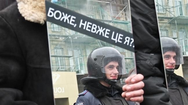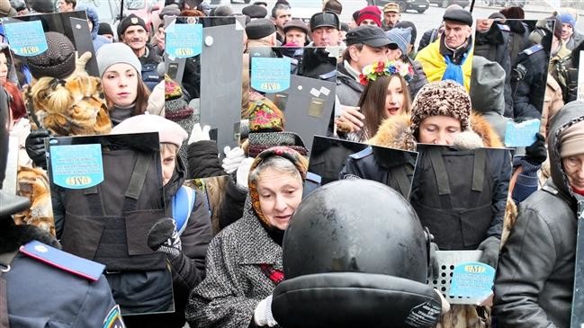 На улице Грушевского перед кордоном милиции, охраняющим подступы к правительственному кварталу, активисты стояли с зеркалами, заставляя бойцов смотреть себе в глаза. На зеркалах была надпись "Боже, неужели это я?".