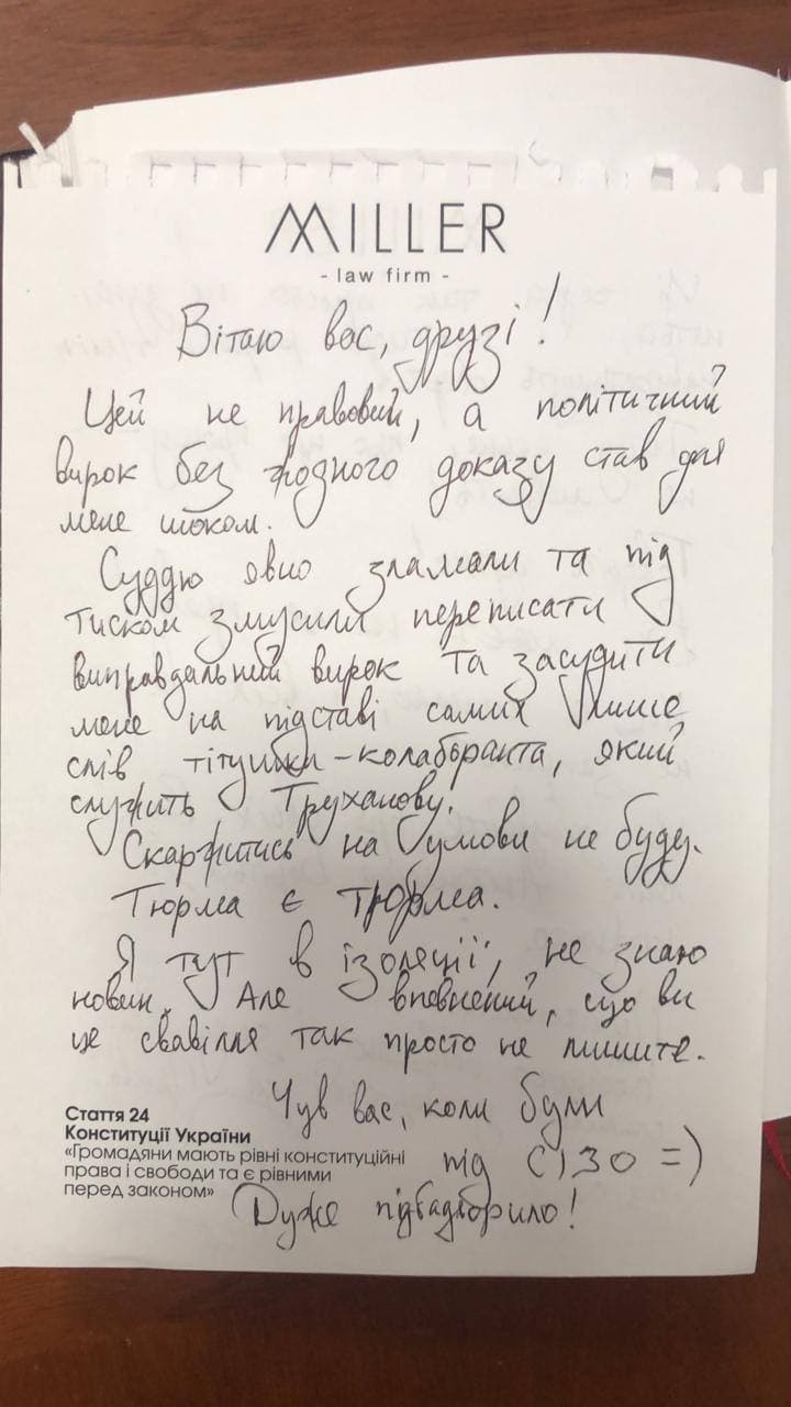 "Этот не правовой, а политический приговор без всякого доказательства стал для меня шоком. Судью явно запугали и под давлением заставили переписать оправдательный приговор и осудить меня на основании одних только слов титушки-коллаборанта, который служит Труханову", - говорится в письме.