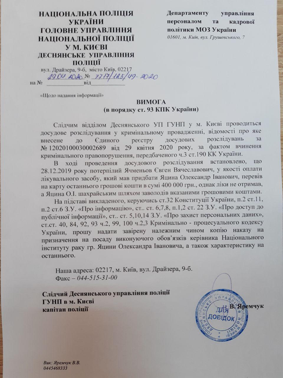 "На основании изложенного, просим предоставить заверенную надлежащим образом копию приказа на назначение на должность исполняющего обязанности руководителя Национального института рака гражданина Яцыны Александра Ивановича, а также характеристику на последнего", - говорится в письме полиции на Департамент кадровой политики Минздрава.
