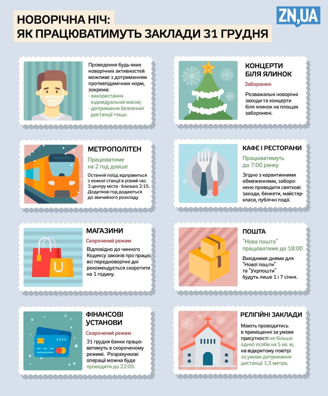 В этом году новогодняя ночь будет по-настоящему особенной. Это связано не только с чудесами, в которые принято верить 31-го декабря, но и с рядом карантинных ограничений, которые были введены из-за пандемии COVID-19. Для читателей ZN.UA мы подготовили памятку о том, как будут работать общественные заведения в Украине 31 декабря.