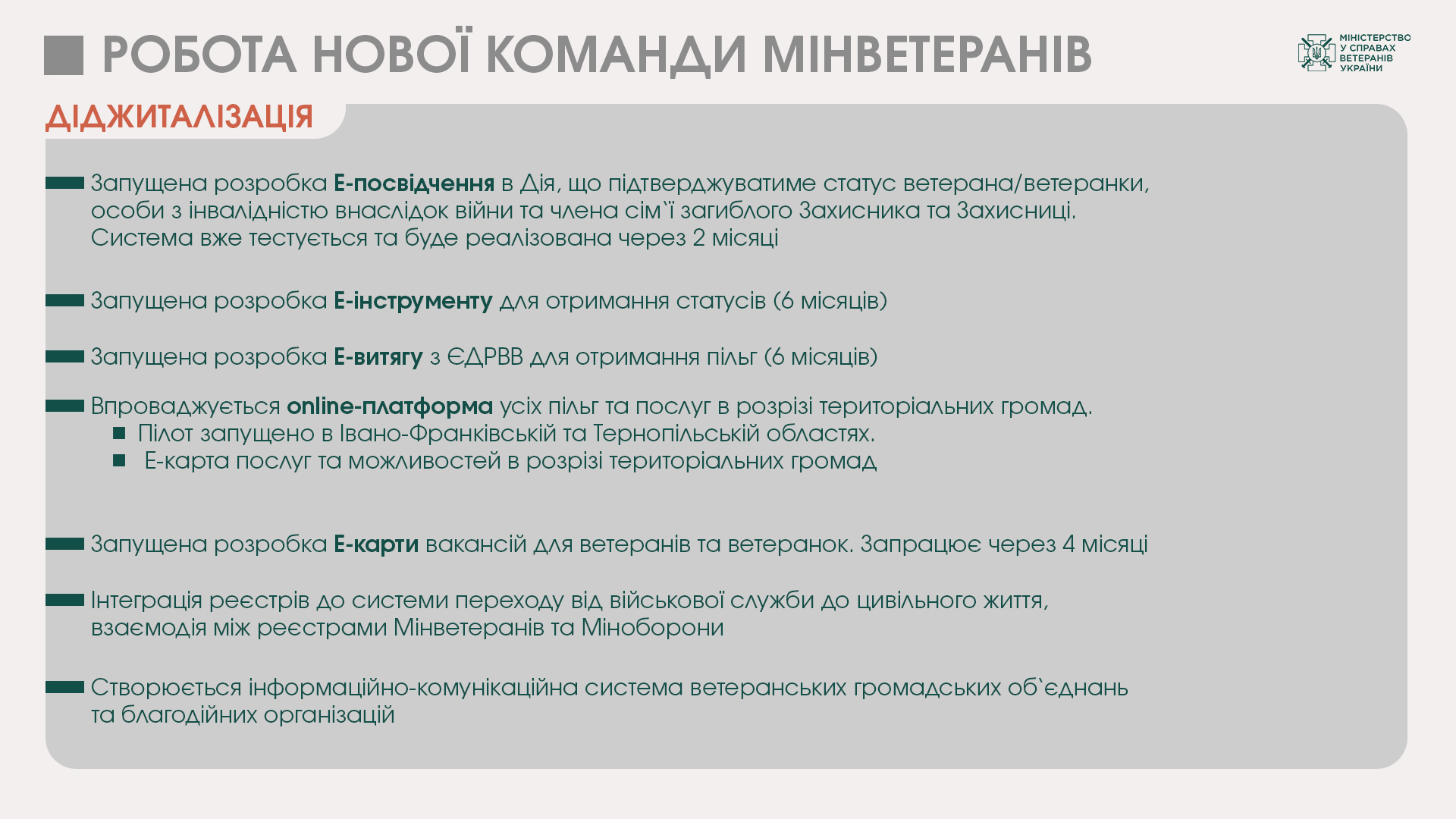 Еще один электронный инструмент ожидается к внедрению через четыре месяца – е-система для демонстрации вакансий для ветеранов и ветеранок. Эта карта будет предоставлять исчерпывающую информацию о возможном трудоустройстве и условиях работы.