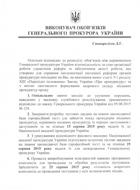 По словам Севрука, расследование установило нарушения. По его словам, работа по подготовке к тестированию кандидатов на должности работников местных прокуратур "практически сведена на нет".