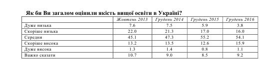 Большинство граждан Украины (54,1%) считают, что качество высшего образования в стране находится на среднем уровне, свидетельствуют данные опроса фонд "Демократические инициативы".