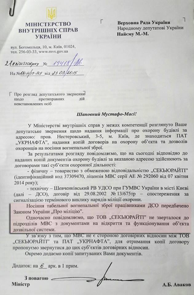 Народный депутат Мустафа Найем обнародовал заявление МВД в котором говорится, что структура, охраняющая здание "Укрнафты", не имеет законного права носить оружие.
