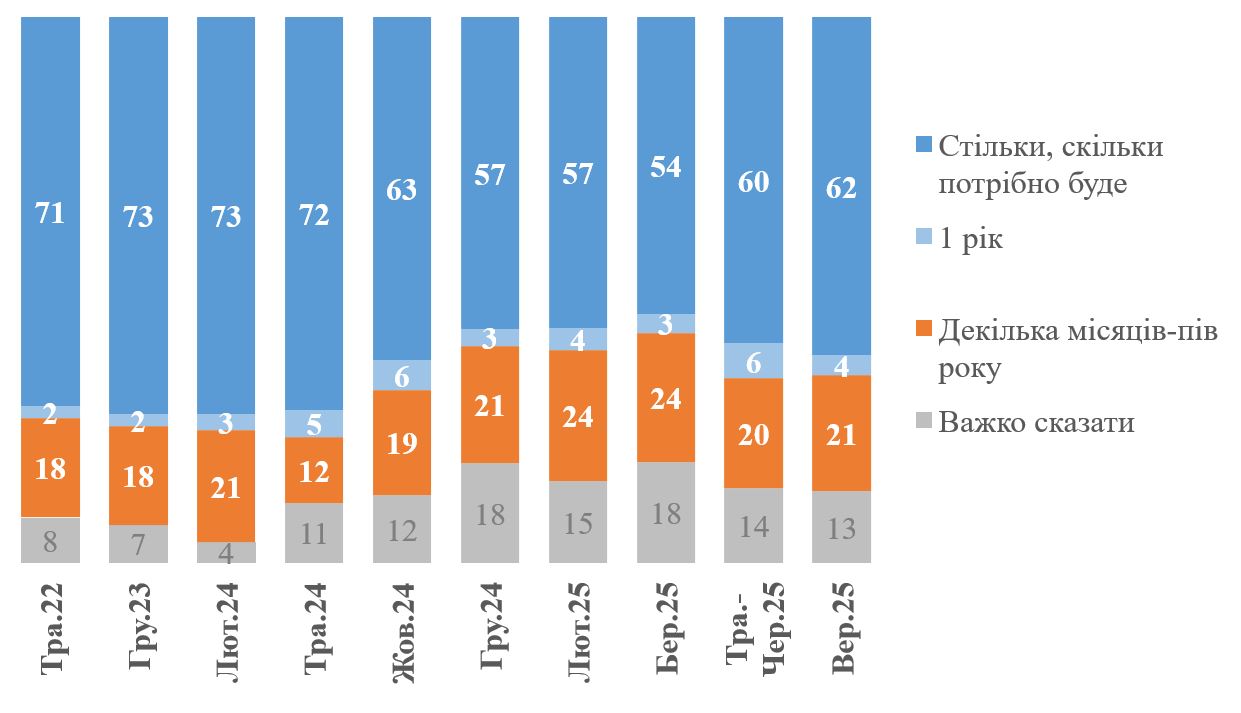 Среди тех, кто ожидает завершения войны в этом году, 41% готовы терпеть столько, будет нужно. Показатель среди тех, кто ожидает завершения 2026 года - 63%, среди тех, кто ожидает 2027 года и позже - 74%. А среди тех, кто ответил "не знаю", готовы терпеть столько, сколько будет нужно - 61%.