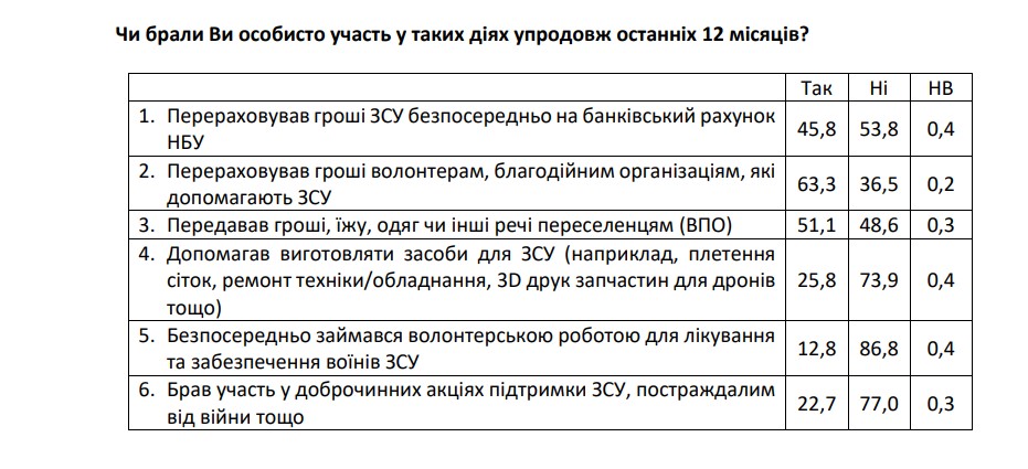 - 13% отмечают, что за последние 12 месяцев занимались непосредственно волонтерской работой в лечении или обеспечении воинов ВСУ.