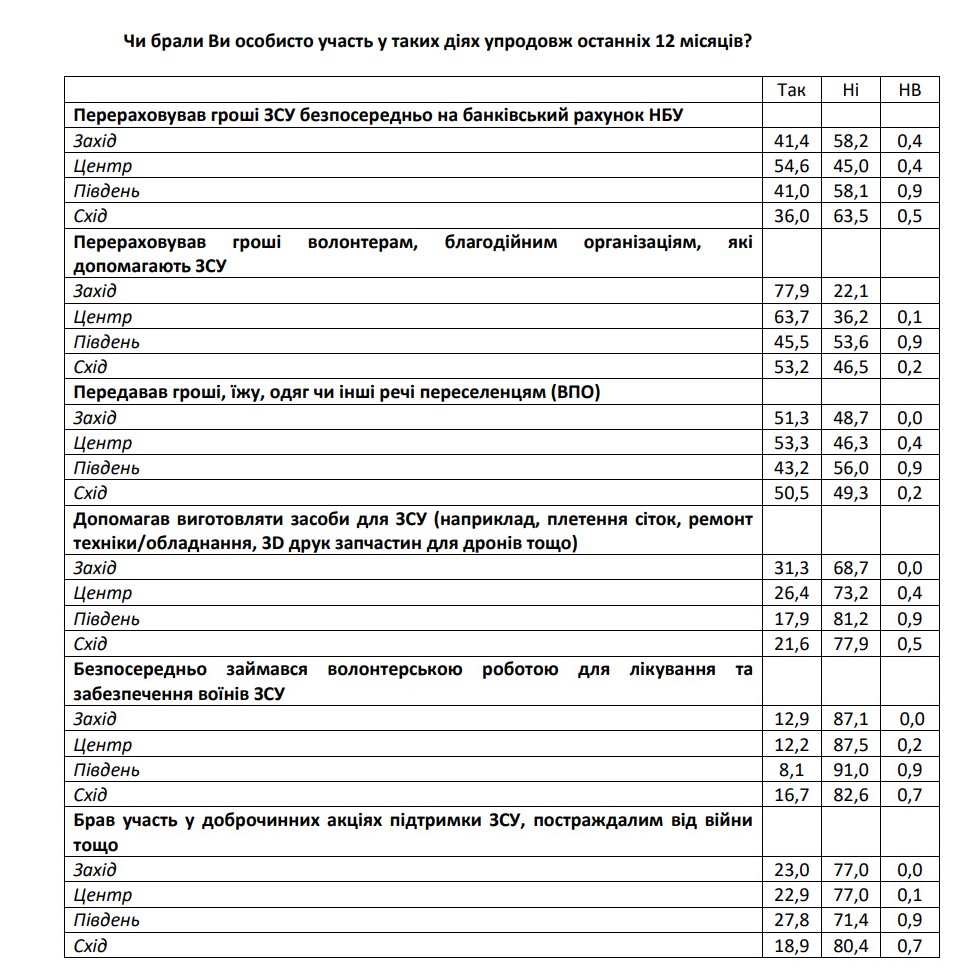 «Демократические инициативы» отмечают, что в региональном разрезе предоставление финансовой помощи в пользу ВСУ несколько меньше фиксируется на Востоке и Юге, но в то же время доля тех, кто разными способами помогает переселенцам, на Востоке такая же, как и на Западе (51%). Наибольшая доля местного населения, лично занимавшегося волонтерской помощью в лечении и обеспечении воинов ВСУ в течение последнего года, – на Востоке Украины (17%).