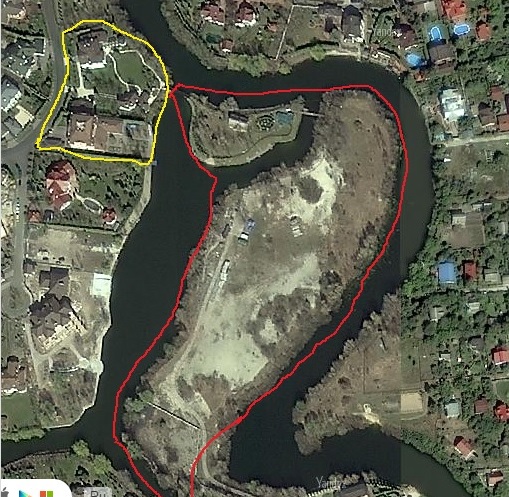 Остров соединяется с берегом мостом (на карте выделен желтым), где расположен другой, уже построенный, дом Левочкиной на участках площадью 0,42 га.