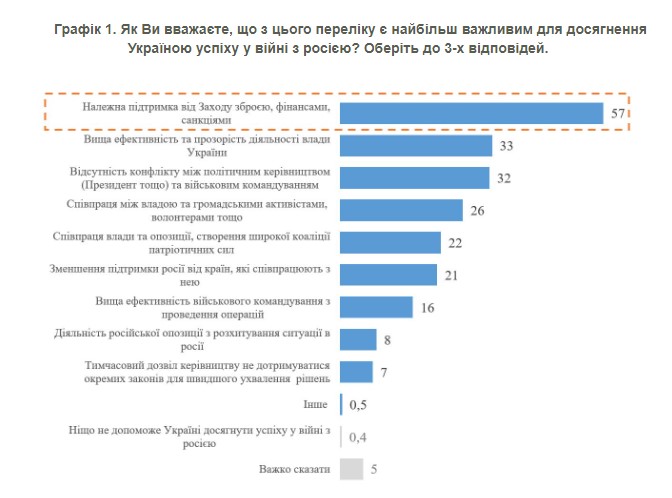 Далее по важности украинцы называют более высокую эффективность и прозрачность деятельности власти Украины (33%), отсутствие конфликта между политическим руководством и военным командованием (32%) и сотрудничество между властью и гражданским обществом (26%).