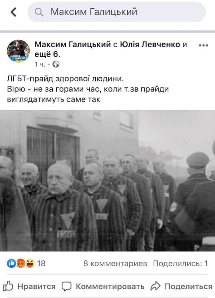Один из заместителей мэра Сум Максим Галицкий перед проведением Марша Равенства в Киеве отметил, что хотел бы видеть представителей ЛГБТ-сообщества в концлагерях. Он опубликовал в Facebook снимок узников концлагеря, написав, что это "ЛГБТ-прайд здорового человека". По данному факту было начато уголовное производство.