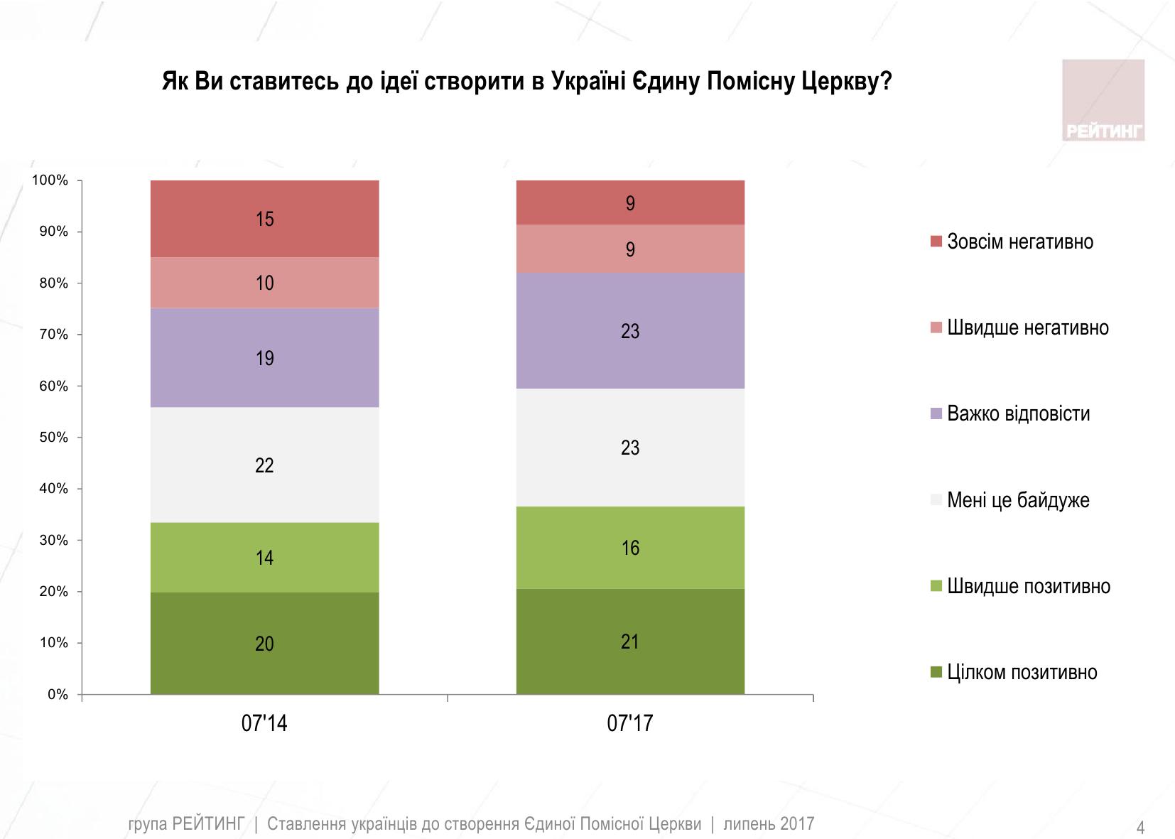 Как отмечают социологи, по сравнению с 2014 годом практически не изменилось количество тех, кто выступает за объединение церквей, в то же время в полтора раза уменьшилось количество противников этой идеи. Вместе с тем, возросло количество тех, кто не имеет четкой позиции в этом вопросе.