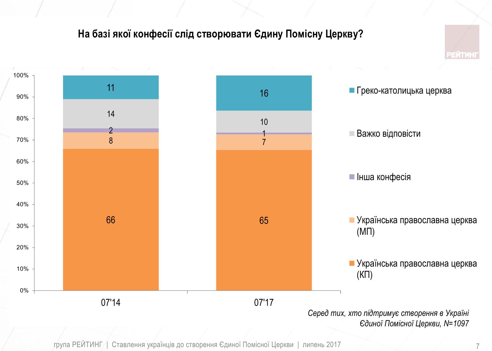 Две трети тех, кто поддерживает идею объединения, высказались за создание единой поместной Церкви на базе УПЦ КП, 16% - за объединение на базе УГКЦ, 7% - УПЦ МП.